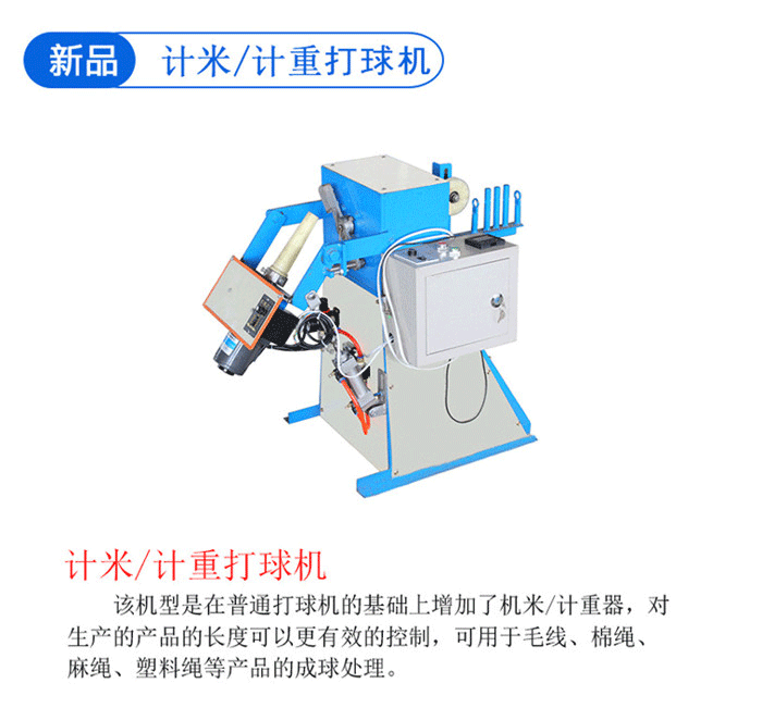 计米/计重打球机 该机型是在普通打球机的基础上增加了计米/计重器,对生产的产品的长度可以更有效的控制,可用于毛线、棉绳、麻绳、塑料绳等产品的成球处理。